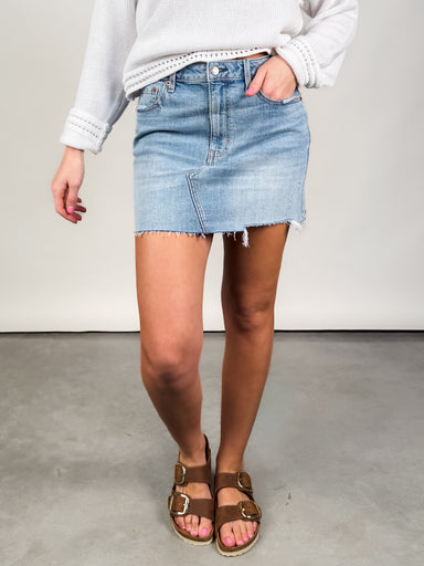 DESCRIPTION: Made for coastal days. An easy little jean skirt made for breezy days by the coast. With a fun front seam and a faded medium wash, i...