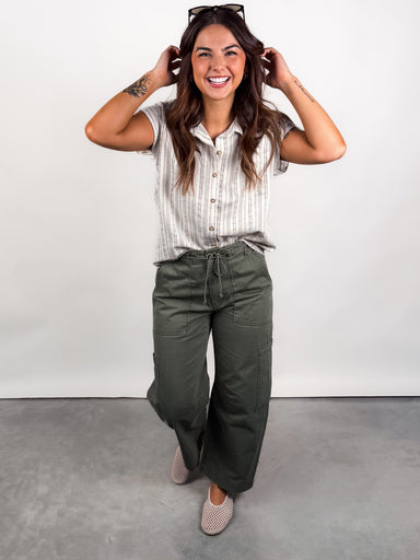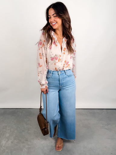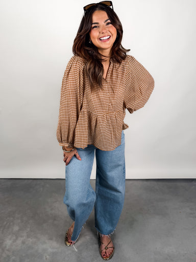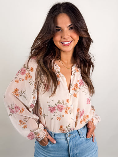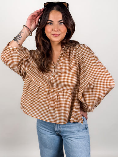 DESCRIPTION: Split Neckline Front Buttons 3/4 Balloon Sleeves SIZE & FIT: Style is relaxed. Model is 5'4 and is wearing a size S. MATERI...