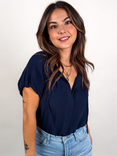 DESCRIPTION: Functional Front Buttons Ribbed Neck and Hem Rolled Sleeve Lightweight SIZE & FIT: Style is relaxed. Model is 5'8 and is wea...