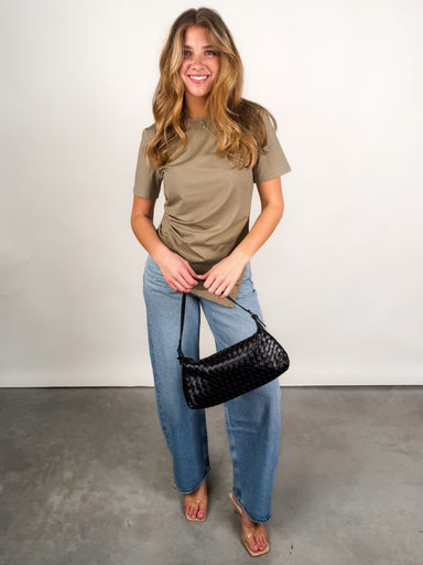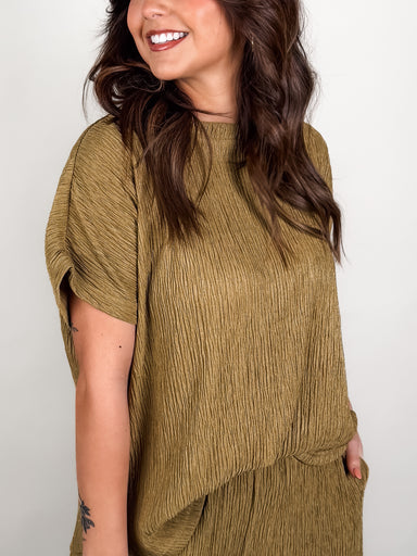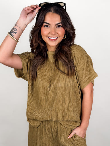 DESCRIPTION: Rounded Neckline Short Sleeves Textured Fabrication with Subtle Sheen Pair with the "Break Her Own Heart Pants" SIZE & FIT: ...