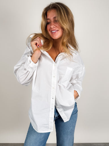 DESCRIPTION: Button Down Front Pocket Detail Longer Length Dropped Shoulder SIZE & FIT: Style is relaxed. Model is 5'8 and is wearing a s...