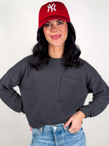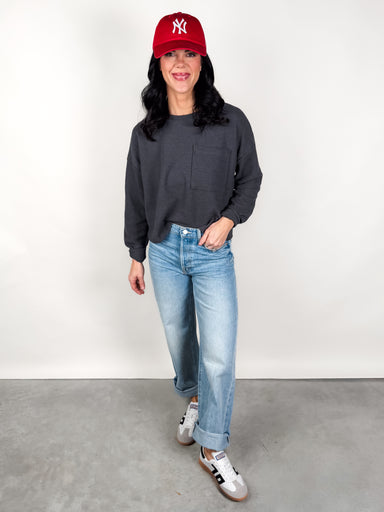 DESCRIPTION: Crew Neckline Dropped Shoulder Front Pocket Detail Pair with Won't Ever Change Pant SIZE & FIT: Style is relaxed. Model is 5...