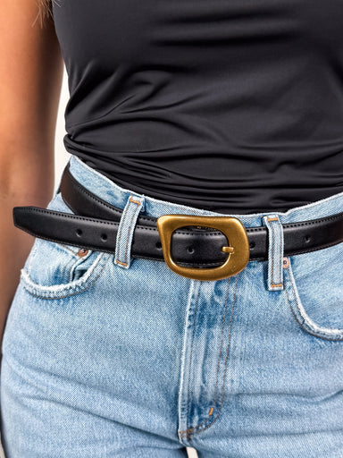DESCRIPTION: The brass-toned circle buckle leather belt is one of our best-selling belts. Made with genuine leather and a single brass-toned ring...