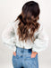 Features a delicate pintuck detailing across the bodice that creates a softly structured, slightly fitted shape and lightweight long sleeves with gentle gathering at the shoulders and cuffs for a feminine drape.