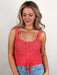 A sleeveless crochet knit top with a soft, open texture and decorative tie detail at the front. Cropped just right, this crochet top styles perfectly with high-waisted separates for a flattering, pulled-together look.