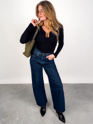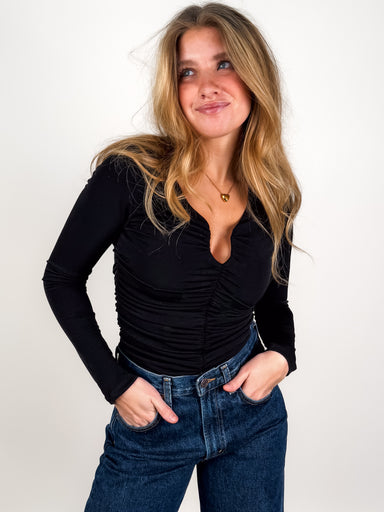 DESCRIPTION: Wire Cutout Detail at Front Ruched Front and Sides Double Layer Long Sleeves SIZE & FIT: Style is fitted. Model is 5'8 and i...