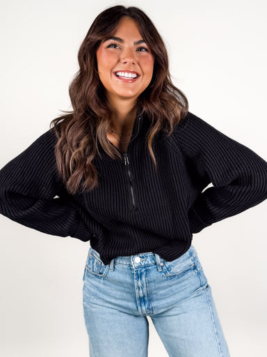 DESCRIPTION: Meet your new favorite everyday Debbie Half Zip sweater layer: a soft, ribbed knit pullover with a boxy silhouette and half-zip clos...