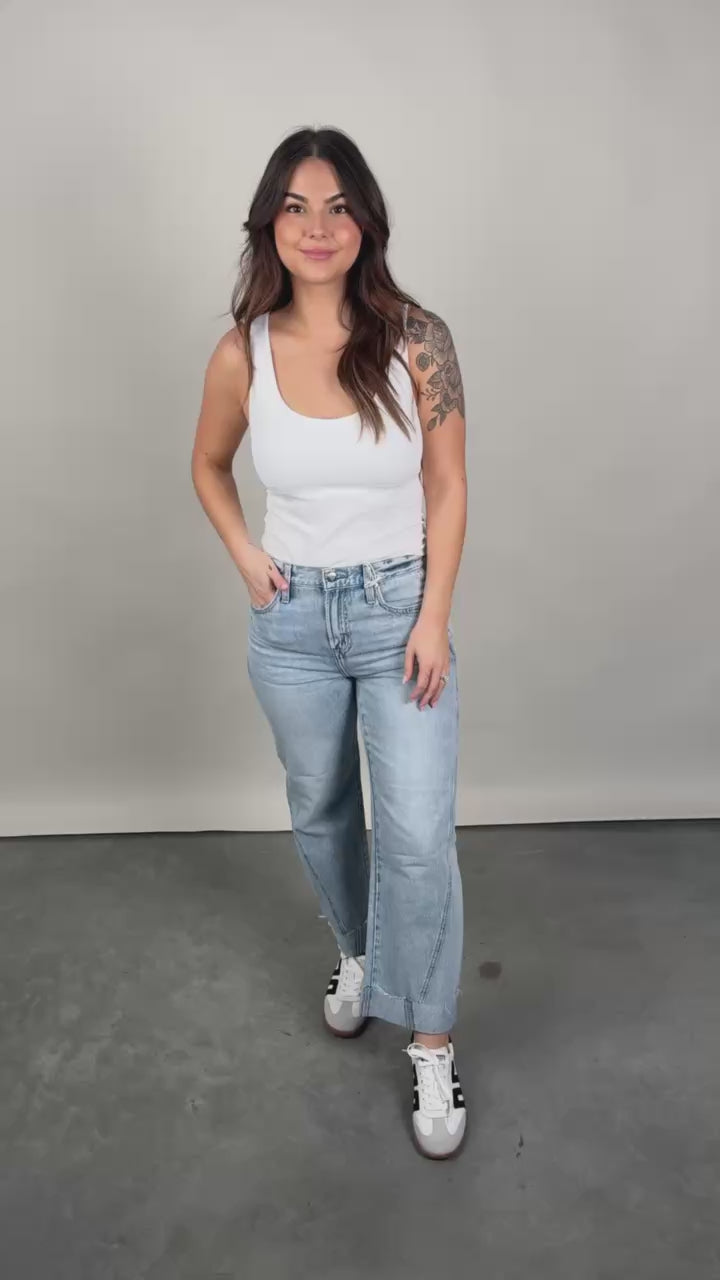 Your new go-to for effortless style. Kacey sits as a comfortable mid rise with an easy boyfriend fit and relaxed silhouette, finished with a 26 1/2" inseam. The stylish cuffed hem adds intentional finishing while thoughtful seaming details subtly elongate your figure. Crafted from lightweight rigid denim in Berkeley, a light wash that feels lived-in and loved.
