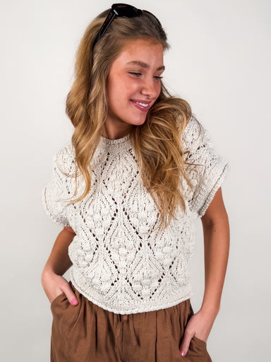 DESCRIPTION: Rounded Neckline Short Sleeves Rolled Hems Textured Knit Fabrication - Semi Sheer SIZE & FIT: Style is relaxed. Model is 5'8...
