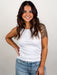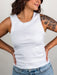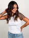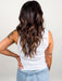 It’s all in the details with feather rib fabric and crochet trim at neckline and arms. We love this updated tank with high waist denim or linen trousers.